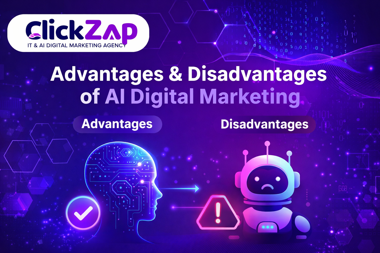 The Advantages and Disadvantages Of AI Digital Marketing clearly show that AI is a powerful marketing tool when implemented strategically.While it enhances efficiency, personalization, and predictive accuracy, it also introduces cost, complexity, and creativity challenges.Businesses that combine AI technology with human expertise achieve long term growth.Partner with ClickZap through our Digital Marketing Services to implement AI-driven strategies that deliver sustainable results.